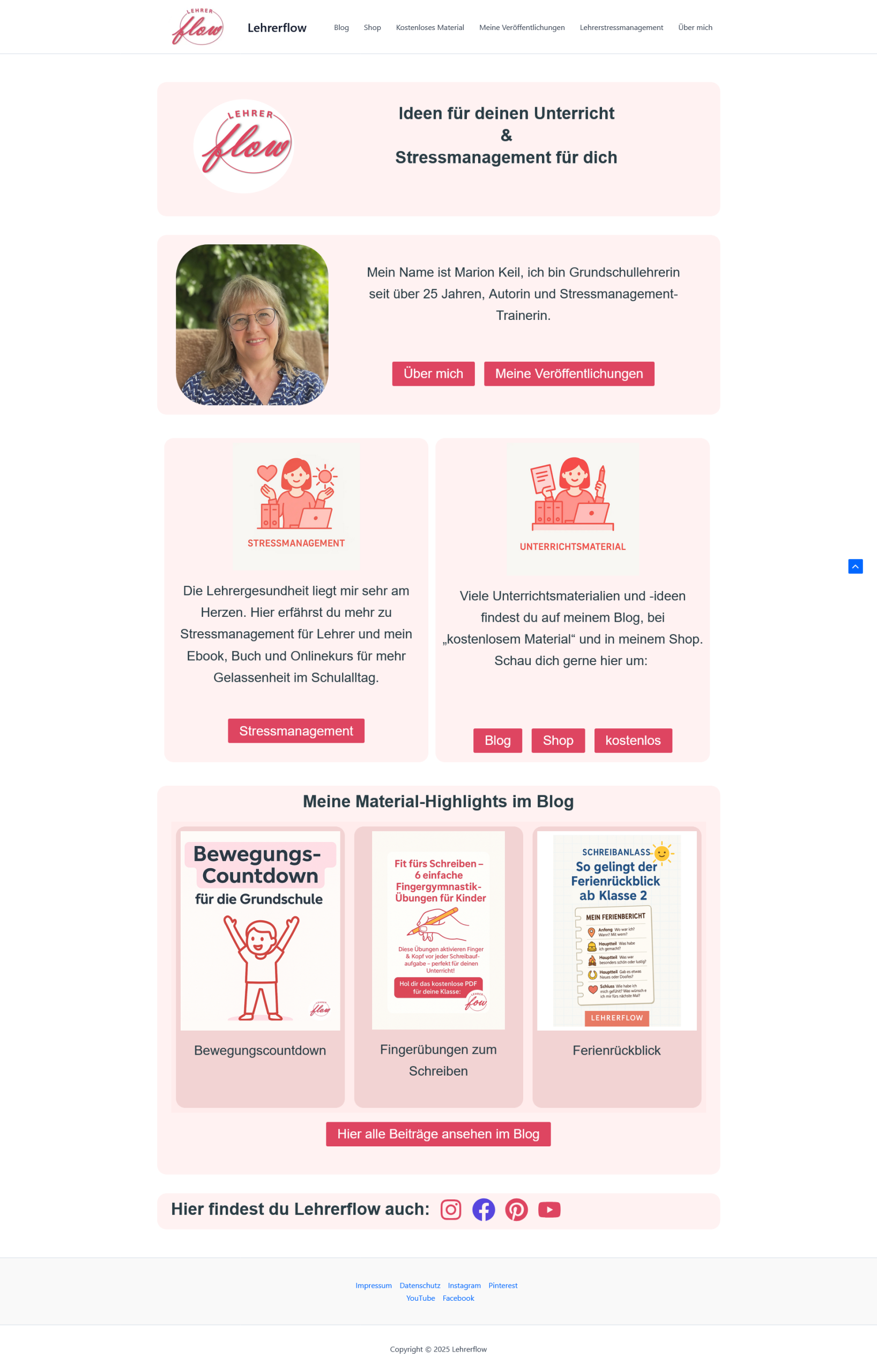 Unterrichtsideen, Lehrerstressmanagement und kostenloses Material – übersichtlich und klar strukturiert.