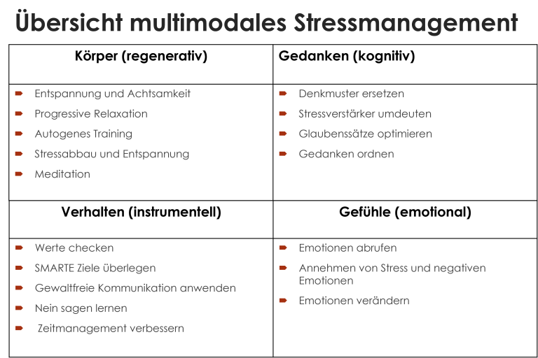 - Methoden aus evidenzbasierter Stressforschung (Achtsamkeit, PR, AT, GFK, Zeitmanagement)